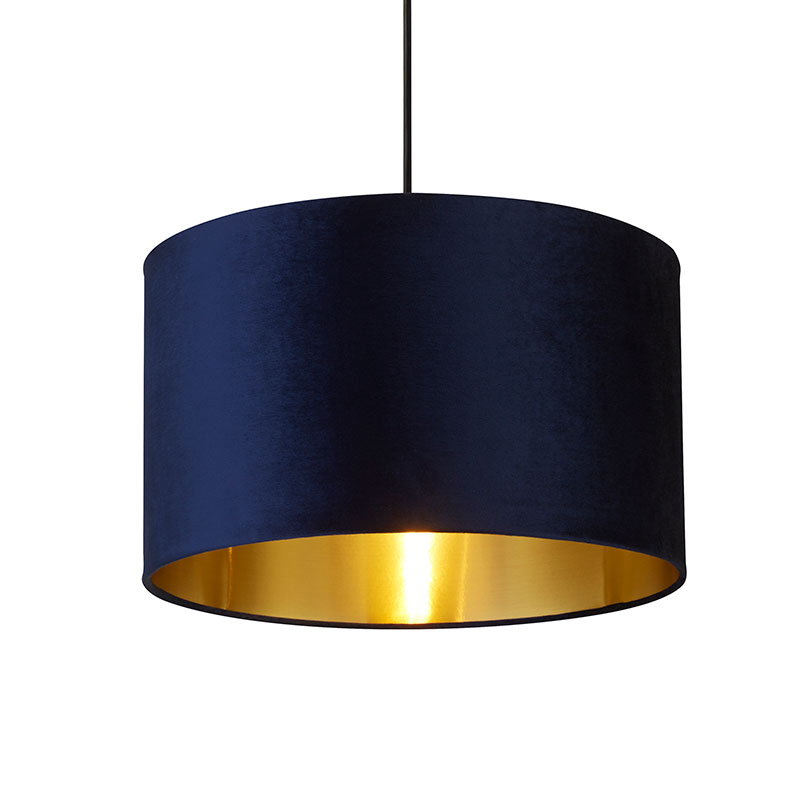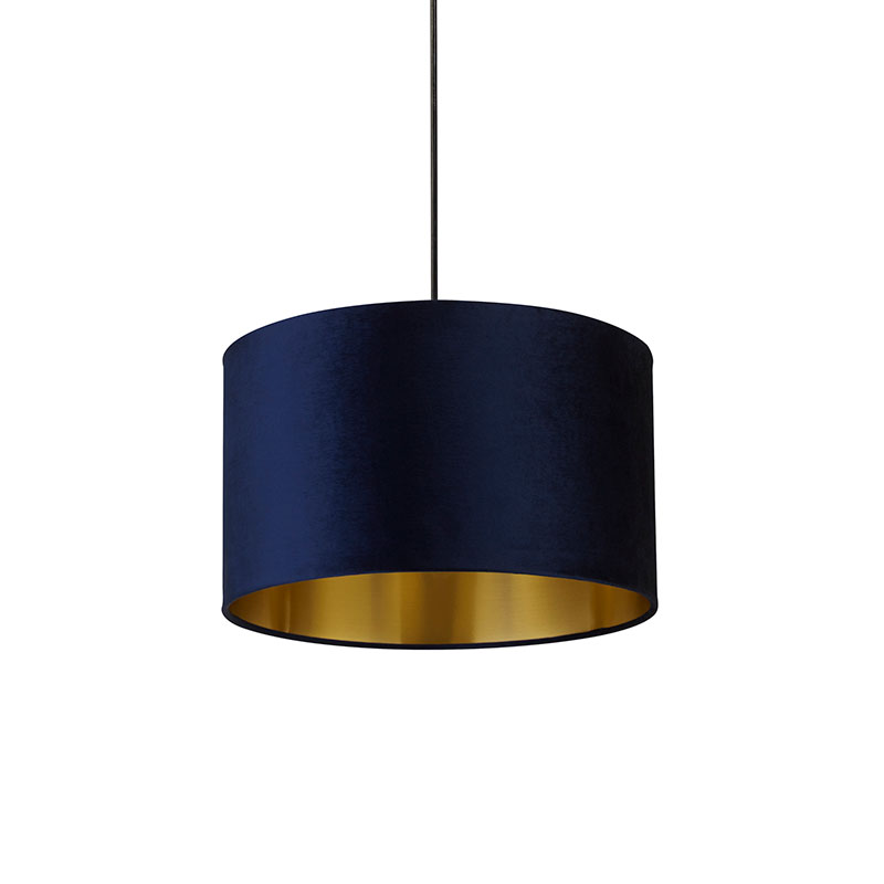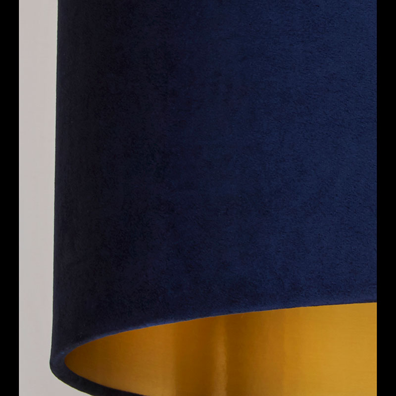 Абажур Shades е с класическа цилиндрична форма и е изпълнен в дълбок тъмносин цвят с вътрешна част в златисто покритие. Комбинацията между меката текстура на кадифето и топлия металически акцент създава изразителен светлинен ефект и придава елегантно излъчване на осветителното тяло.