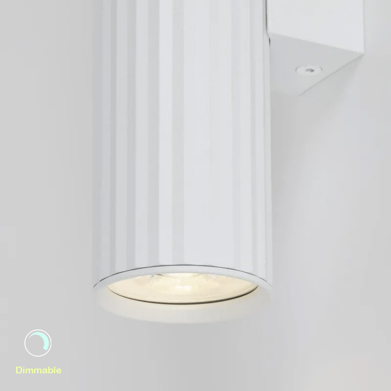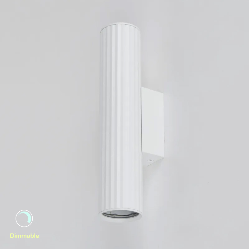 Аплик Anna1, изработен от алуминий в матиран бял цвят с характерна оребрена повърхност и издължена цилиндрична форма. Лампата за стена е подготвена за две крушки, създавайки индиректно осветление, което ще подчертае интериора ви със елегантен светлинен ефект.