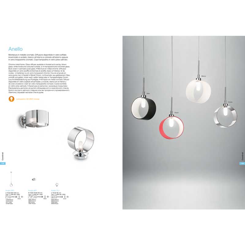 Аплик Anello с оригинален дизайн. Хромирана основа и стъклен дифузер от матирано стъкло, което се предлага в два варианта - прозрачно хромирано стъкло или с бяла вътрешна част и цветна външна. Капачета за крушки от сатенирано огнеупорно стъкло. Производител Идеал Лукс, Италия.