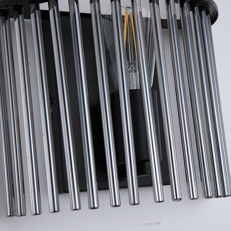 Абажурът е изграден от вертикално подредени стъклени елементи в опушен нюанс, които създават изразителна игра на светлина и сянка. Стъклото омекотява светлината и я разпръсква равномерно, създавайки уютна и изискана атмосфера, без да заслепява.
