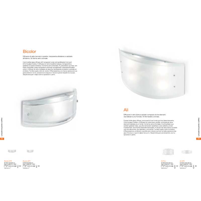 Аплик за стена с дифузер, изработен от едно фронтално и две странични стъкла с матиран завършек и държачи от хромиран метал. Серия Ali на Ideal Lux, Италия.