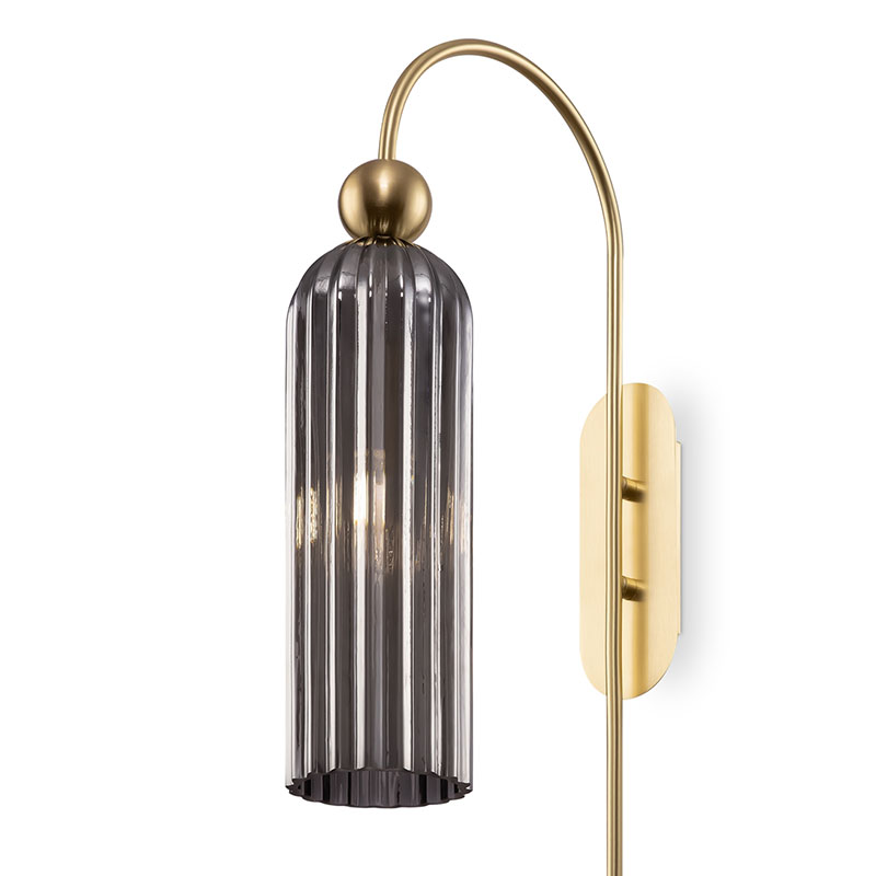 Аплик Antic, изработен от метал в луксозен златист цвят с елегантен разсейвател от релефно стъкло в сив цвят. С балансираната комбинация от златисти метални елементи и сив стъклен разсейвател, осветителното тяло Antic внася елегантност и финес във всеки интериор, превръщайки се в привлекателен детайл, който допълва цялостната атмосфера на дома.