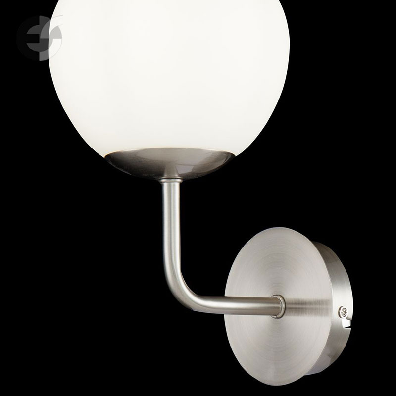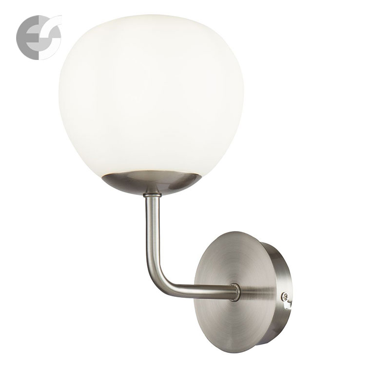Лампата за стена Erich се отличава с декоративната бяла стъклена сфера, която създават мека и приятна светлина. Никеловото покритие на металната основа добавя топъл акцент и контраст към белия разсейвател, създавайки балансирана визуална композиция.