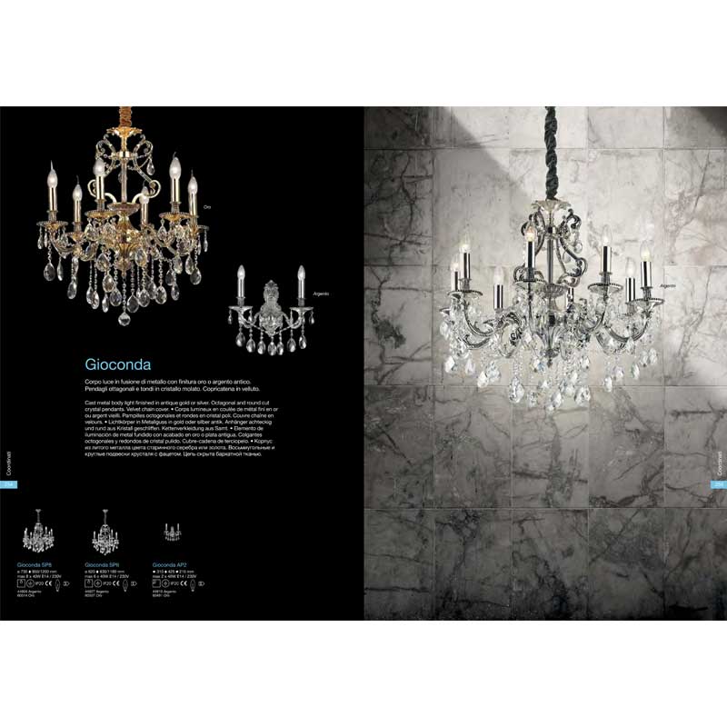 Аплик за стена с тяло от отлят метал с красиви орнаменти и покритие в състарено злато или сребро. Декорация от осмоъгълни и капковидни нанизи кристали. Кабел, покрит с кадифен плат. Серия осветителни тела Gioconda на Ideal Lux, Италия.