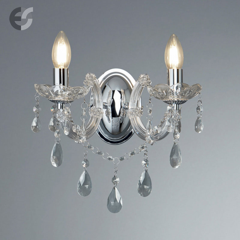 Осветително тяло - аплик от серия осветителни тела Marie Therese, изработен от метална основа с хромирано покритие и рамена и изящни декоративни елементи от прозрачен акрил, имитиращ кристал. Производител Searchlight, Англия.