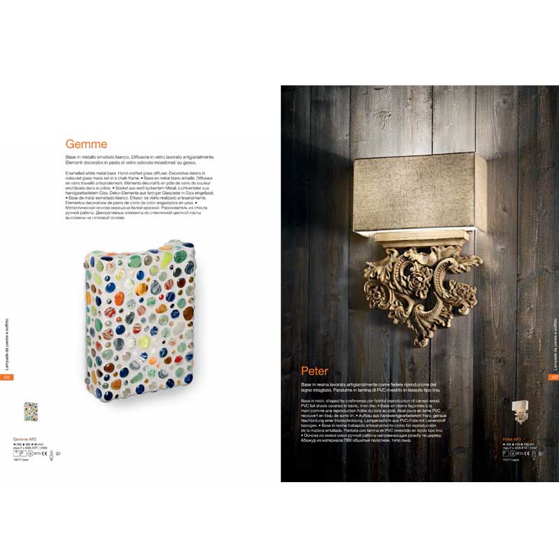 Оригинален стенен аплик Peter с основа от смола, ръчно обработена така, че достоверно да имитира дърворезба и абажур от PVC, покрит с текстил, наподобяващ лен. Производител Идеал Лукс, Италия.