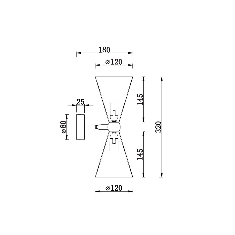 Апликът Vesper е изработен от метал в бял цвят с контрастен златист акцент във вътрешната част на конусовидните дифузри. Лампата за стена впечатлява с елегантен дизайн тип "пясъчен часовник" и две симетрични конусовидни форми, създаващи стилен и модерен вид.