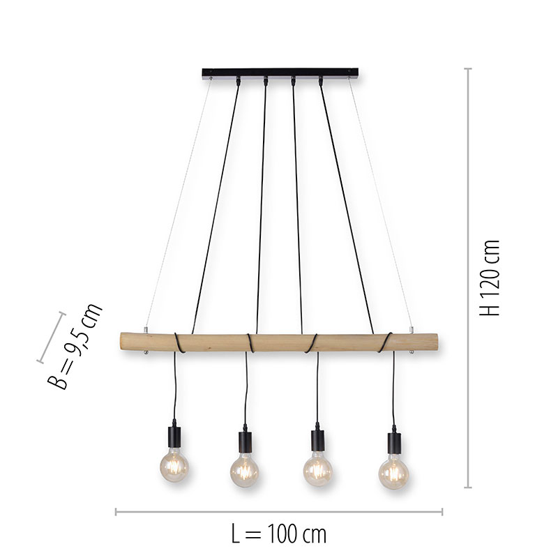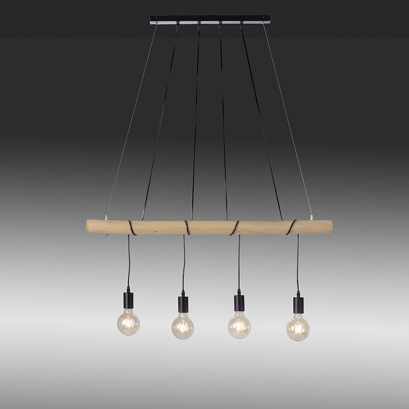 Осветително тяло - винтидж линеен полилей, изработен от метална основа в черен цвят и дървена греда. Пенделът e с четири LED крушки по 4W, включени в комплекта. Всяка крушка излъчва около 346 лумена и излъчва приятна топло-бяла светлина. Кехлибареното стъкло придава на лампата носталгичен чар и се вписва идеално в модерния винтидж стил. Дизайнът на осветителното тяло е подходящ за осветление за всекидневна, осветление за кухня, осветление за коридор, осветление за спалня. Производител Leuchten Direkt, Германия.