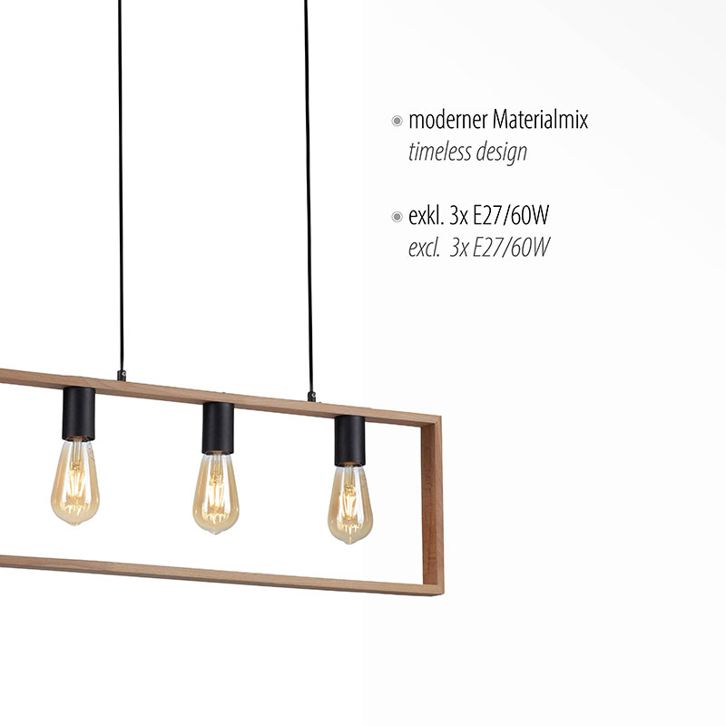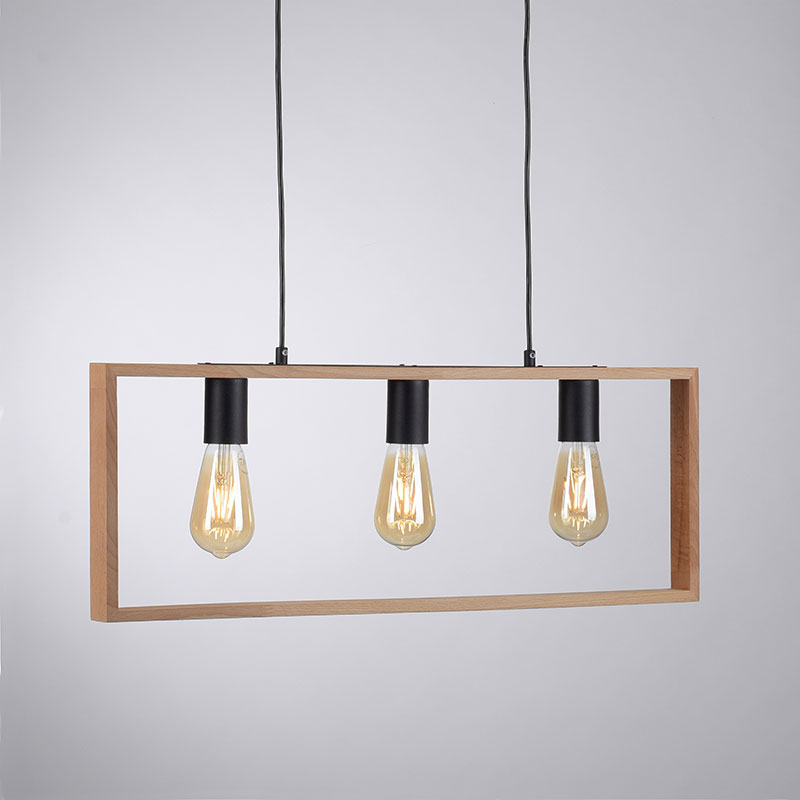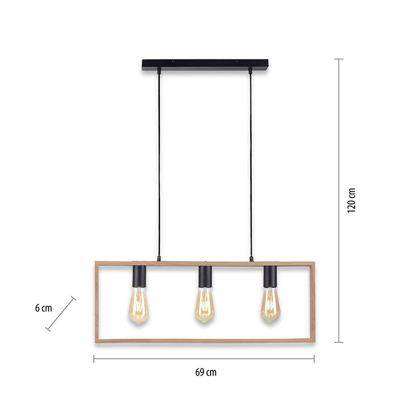 Винтидж полилей FRAME с възможност за регулиране на височината преди монтаж, изработен от метална основа в черен цвят и правоъгълна рамка от акациево дърво, която подчертава трите светлоизточника. Висящата лампа е с 3 фасунги E27, подходящи за крушки с максимална мощност до 60W всяка.