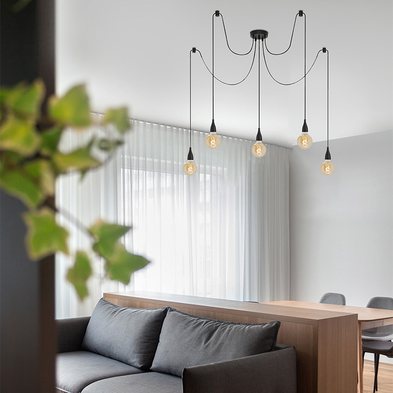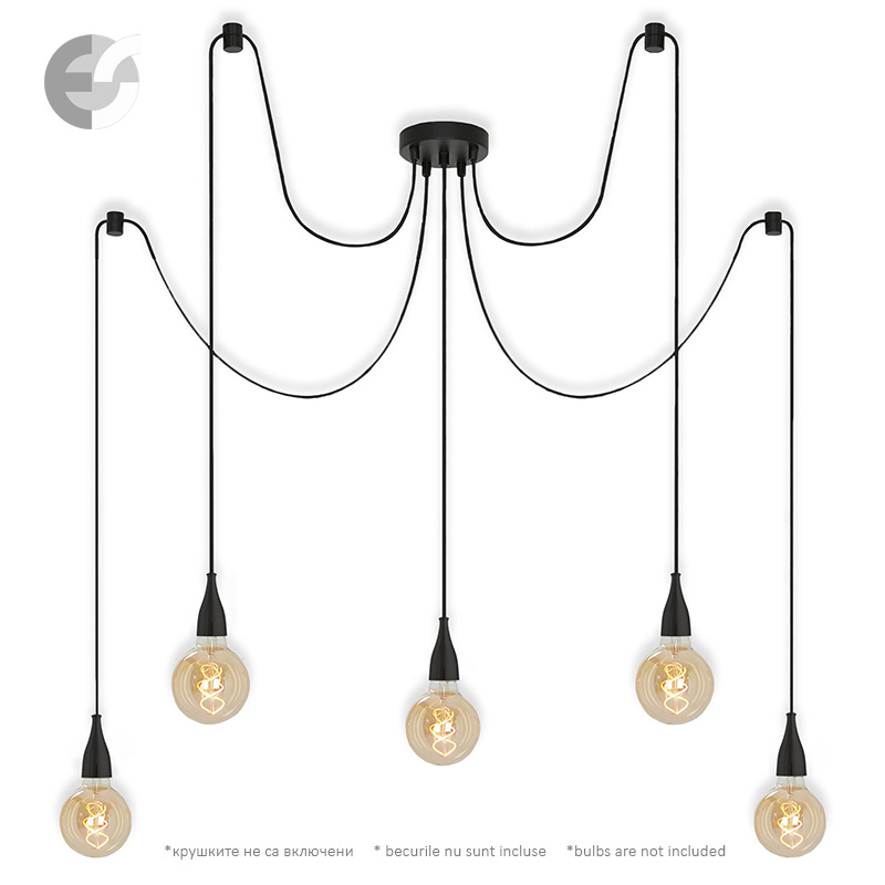Осветително тяло - винтидж полилей тип паяк, изработен от метал и черен PVC кабел. Дължината на кабелите са : 4 х 1,80м и 1 х 1,20м. Стоперите за таван са включени в комплекта. Полилеят е подходящ за осветление за всекидневна, осветление за заведение, осветление за трапезария или коридор. Производител Coup Light, България.