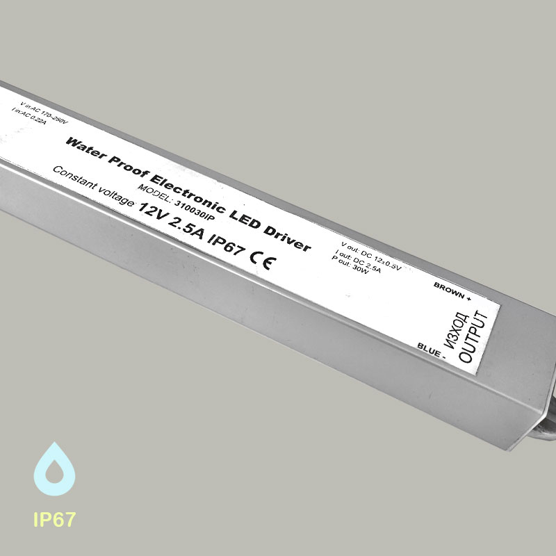 Влагозащитено LED захранване за осветителни тела и осветление с максимална мощност до 30W. Входящо напрежение от 170V до 250V и изходящо напрежение 12V. Степен на защита от влага и прах IP 67.