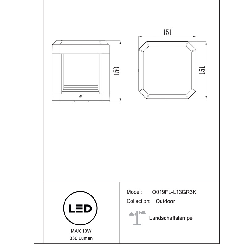 LED градински фенер Royal Mile, изработен от лят алуминий с прахово боядисано покритие в графитеносив цвят и впечатлява с компактна и модерна форма. Вграден LED модул с мощност 13W осигурява топла светлина с цветна температура 3000K и светлинен поток 330 lm – достатъчен за уютно и дискретно осветяване на зони около дома.