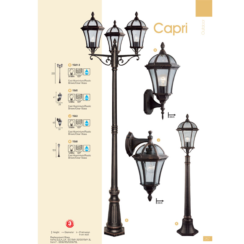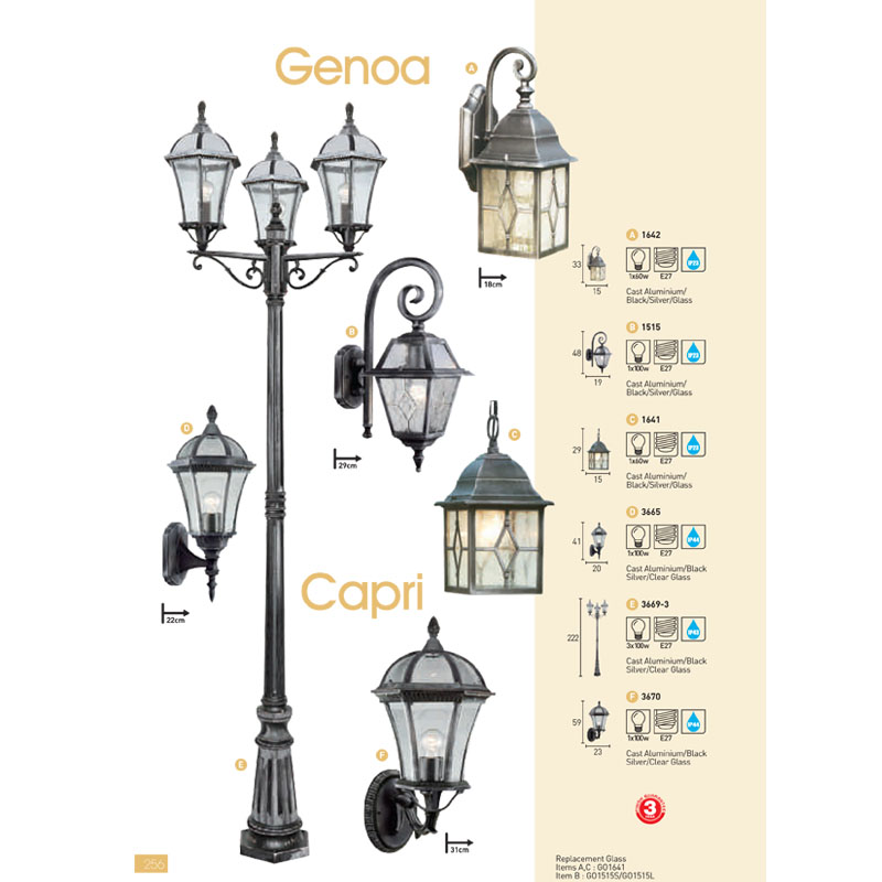 Осветително тяло - градински стълб във винтидж стил, със защита от влага и прах, изработен от лят алуминий, боядисан в черно-сребрист цвят и с дифузер от прозрачно стъкло. Част от серия осветителни тела Genoa на Searchlight, Англия.