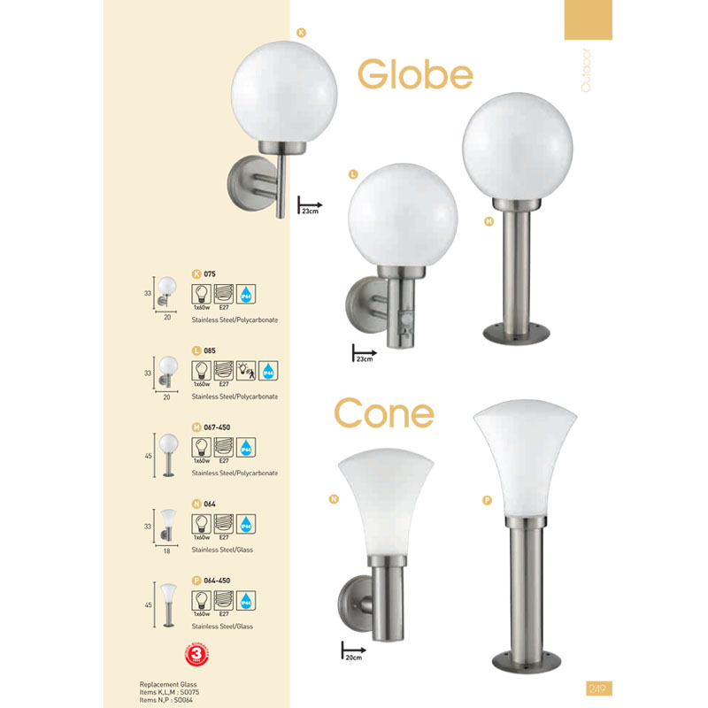 градинско осветително тяло - аплик за външно осветление със сферичен поликарбонатен разсейвател и база от неръждаема стомана. Серия осветителни тела Globe на SearchLight, Англия.