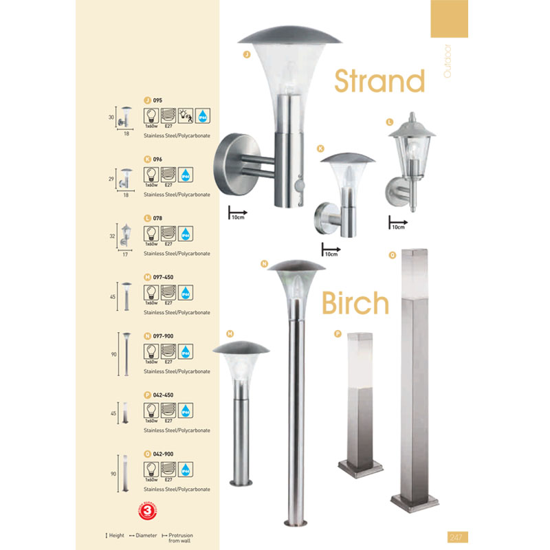 Градинско осветително тяло - фасаден аплик Strand със защита от влага и прах, изработен от неръждаема стомана и прозрачен поликарбонат. Производител Searchlifght, Англия.