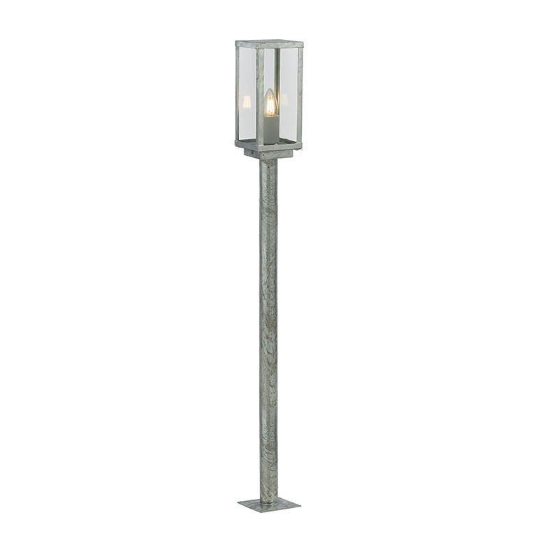 Осветително тяло - градински стълб BOX, изработен от поцинкован сребрист метал и прозрачно стъкло. Артикулът е с висока защита срещу влага и прах IP 44. Производител Searchlight, Англия.