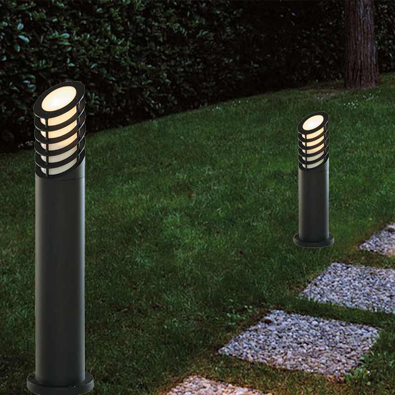 Осветително тяло - градинско колче с модерен дизайн, част от серия Bollards and post lamps. Корпус от лят алуминий, боядисан в черно и дифузер от матирана пластмаса. Производител Searchlight, Англия.
