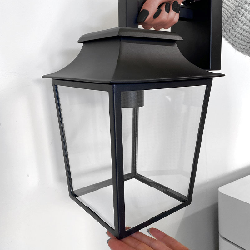 Градински фенер Vesper Lantern, изработен от метал в черен цвят и с разсейвател от прозрачно стъкло. Апликът за стена е във винтидж стил, който добавя характер и автентичност към всеки екстериор.