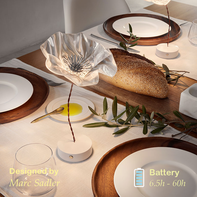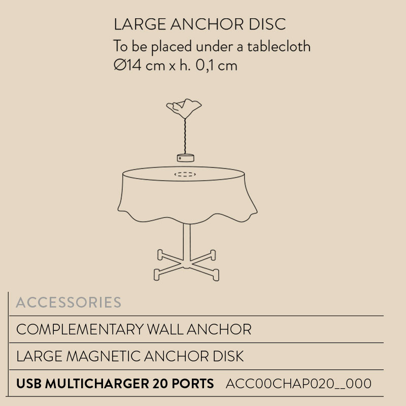 LaFleur е оборудвана с интегриран димер и LED батерия (1,3W – 150 lm – 2700K), която осигурява до 6,5 часа автономна работа при максимална светлина и до 60 часа при минимална интензивност. Зареждането става лесно чрез мулти-порт станция, подходяща за индустрията на ресторантьорството, хотелиерството или кетъринг компаниите (Ho.Re.Ca). Можете да поръчате допълнително захранваща станция с кат. номер: (ACC00CHAP020__000). Лампата е с магнитна основа в матиран бял или черен цвят. В комплекта е включен стоманен магнитен диск за стабилно фиксиране върху барплот или под покривка на маса, което я прави изключително практична за ресторанти, специални събития или за домашна употреба.