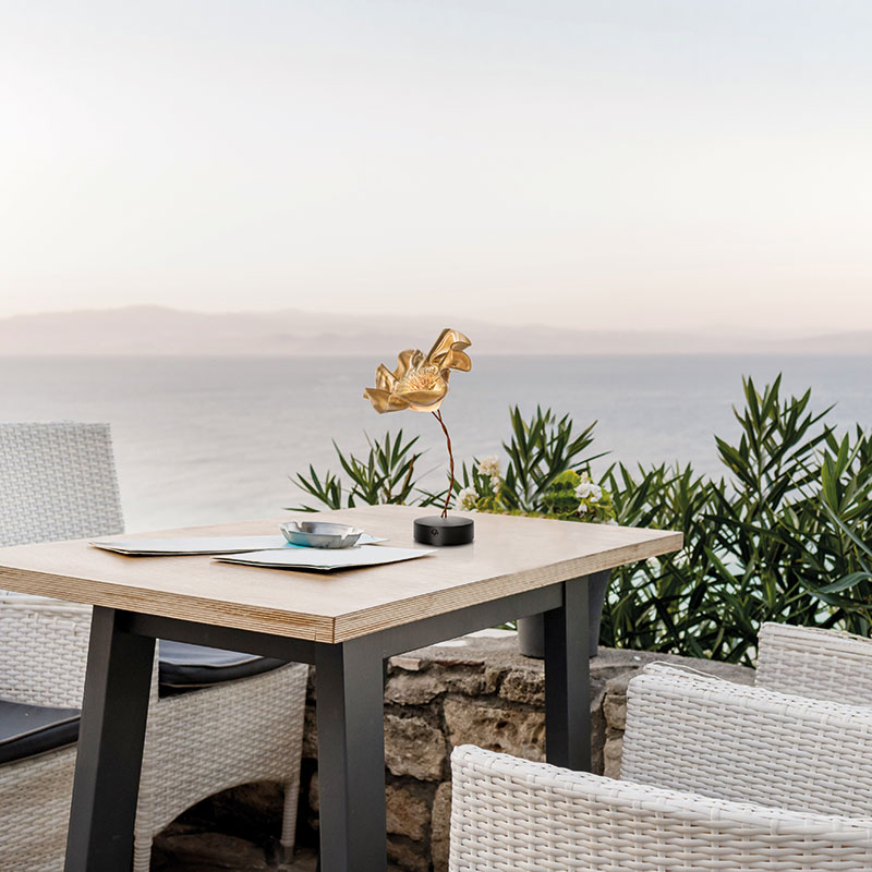 LAFLEUR VELVET е с вграден димер и LED батерия (1,3W – 150 lm – 2700K), която осигурява до 6,5 часа автономност при максимална светлина и до 60 часа при минимална интензивност. Зареждането става чрез мулти-порт станция, подходяща за индустрията на ресторантьорството, хотелиерството или кетъринг компаниите (Ho.Re.Ca). При необходимост можете да поръчате допълнително захранваща станция с кат. номер (ACC00CHAP020__000). Лампата е снабдена с магнитна основа в матиран черен или бял цвят, а в комплекта е включен метален магнитен диск за стабилно фиксиране върху различни повърхности – барплот или на маса под покривка.
