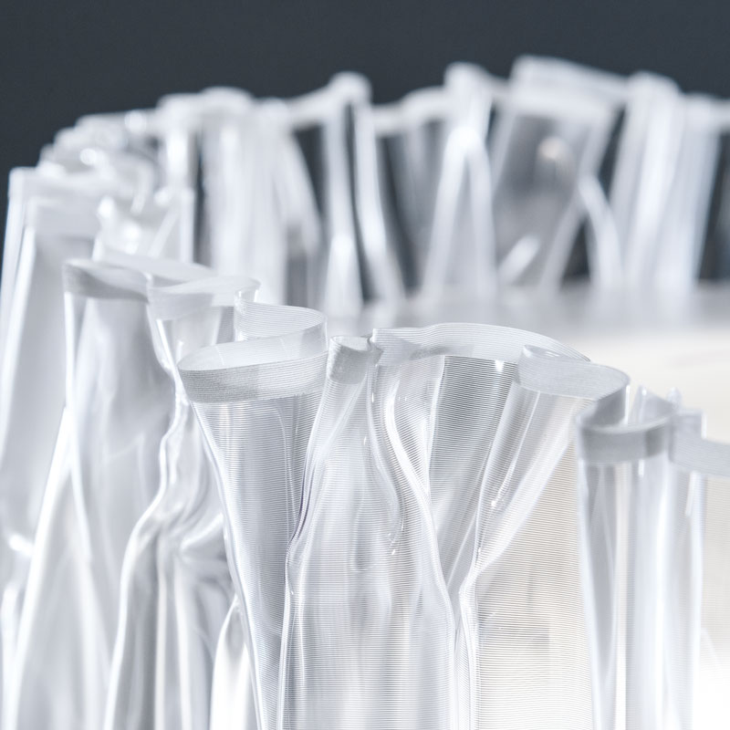 Всяка настолна лампа от серията ACCORDÉON е уникална - благодарение на процеса Technoforming, при който материалът Lentiflex® се формира на ръка при високи температури. Lentiflex® е патентован материал, разработен от италианската компания Slamp. Той е технополимерен лист, характеризиращ се с лещовидна структура, наподобяваща поредица от призми, които улавят и насочват светлината. Това създава уникален визуален ефект, често описван като флуиден или подобен на водопад. Този уникален подход прави всяко изделие единствено по рода си, с форми и текстури, които никога не могат да бъдат възпроизведени механично.