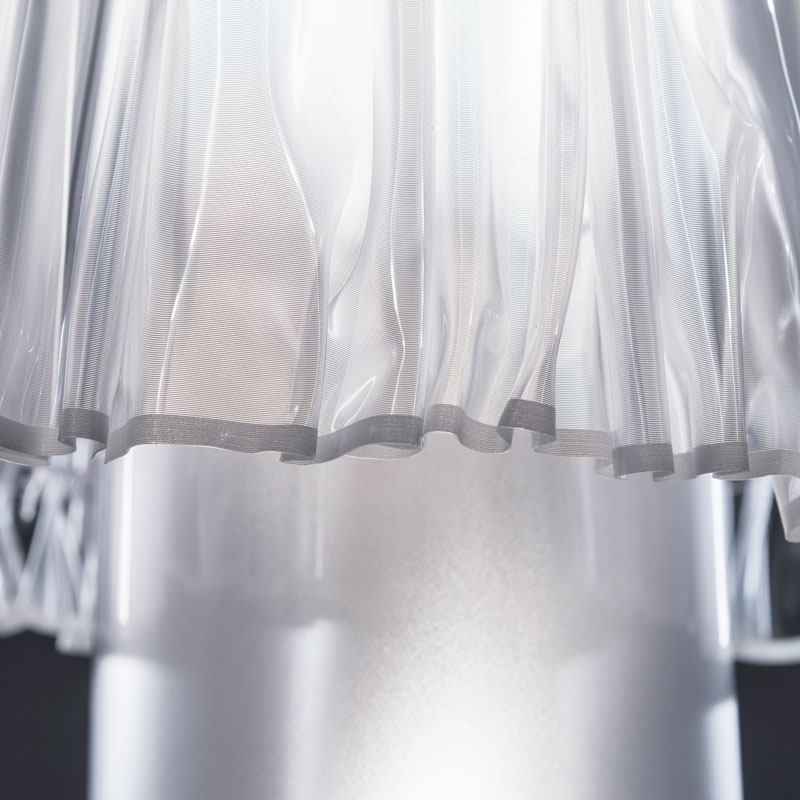 Плисираният абажур отразява светлината, създавайки меки сенки, докато полупрозрачната цилиндрична основа излъчва равномерна светлина в долната част на лампата. Осветителното тяло е с два бутона ,разположени на кабела за лесно включване и изключване. Единият ключ е за абажура, а другия е за основата, като можете да включите само основата за деликатно амбиентно осветление или и двете нива за пълна яркост. Благодарение на магнитната система, можете лесно да махнете разсейвателя за почистване или смяна на крушките. Лампата е с 2 х 12W E27 LED крушки и 1 х 6W E14 LED крушка.