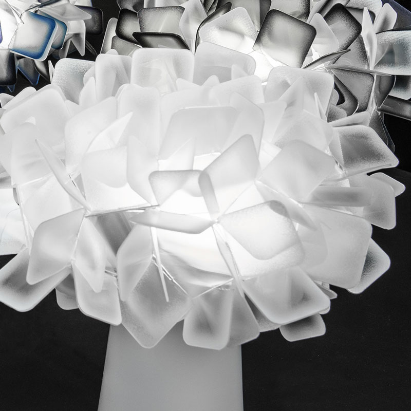 Настолната лампа CLIZIA е изработена от патентования материал Cristalflex® – технополимер, разработен от италианската компания Slamp. Cristalflex® притежава прозрачност и блясък, наподобяващи кристал, но същевременно е лек, устойчив и гъвкав. Това го прави изключително подходящ за създаването на дизайнерски осветителни тела, които съчетават елегантност и практичност. Лампата излъчва чистота и мекота, превръщайки светлината в нежен декоративен акцент.