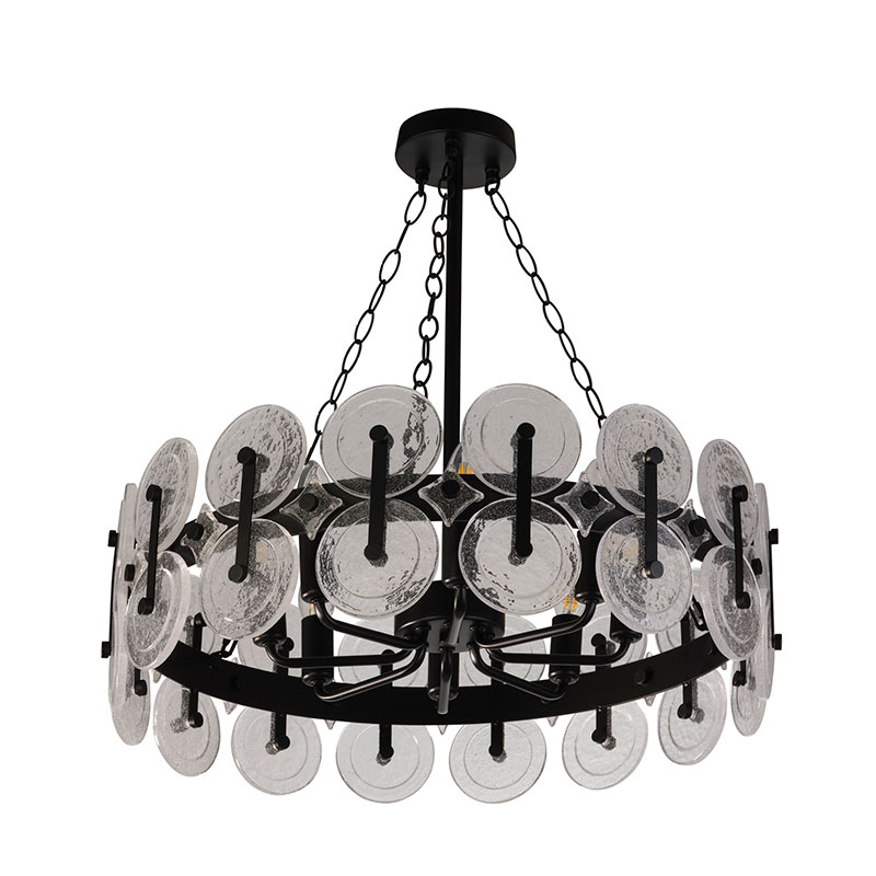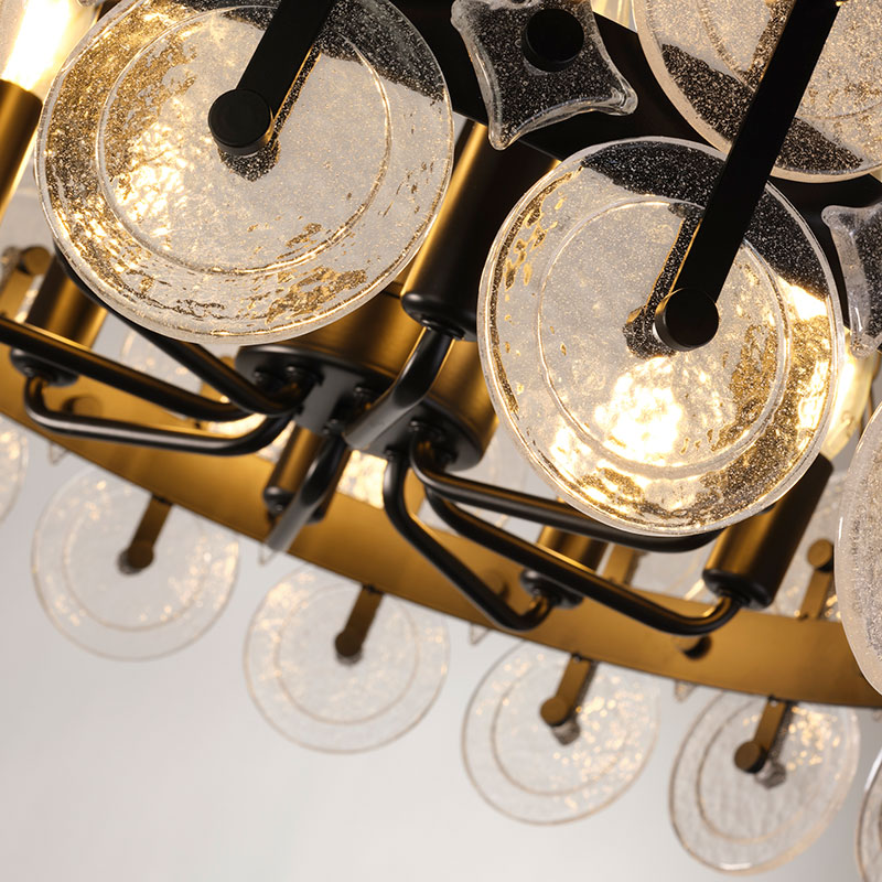 Черният метален корпус допълва прозрачните стъклени дискове, всяко от които е украсено с деликатни балончета, които добавят изисканост и уникалност на цялостния вид на полилея. Този съвременен дизайн е подходящ за различни интериорни стилове и е идеален за осветление на трапезария, хол или спалня.
