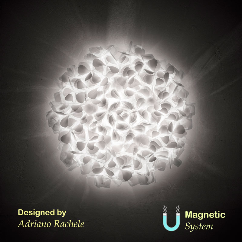 Материалът Cristalflex® представлява връх на италианските иновации - технополимер, който предлага блясъка и прозрачността на кристала, но с добавените предимства да бъде лек, гъвкав и устойчив. Специалният отпечатък на листенцата, които се припокриват, създават мека светлина в интериора. Осветителното тяло е с тегло от 4,5 кг и магнитна система за окачване, което позволява лесна инсталация, почистване и поддръжка.