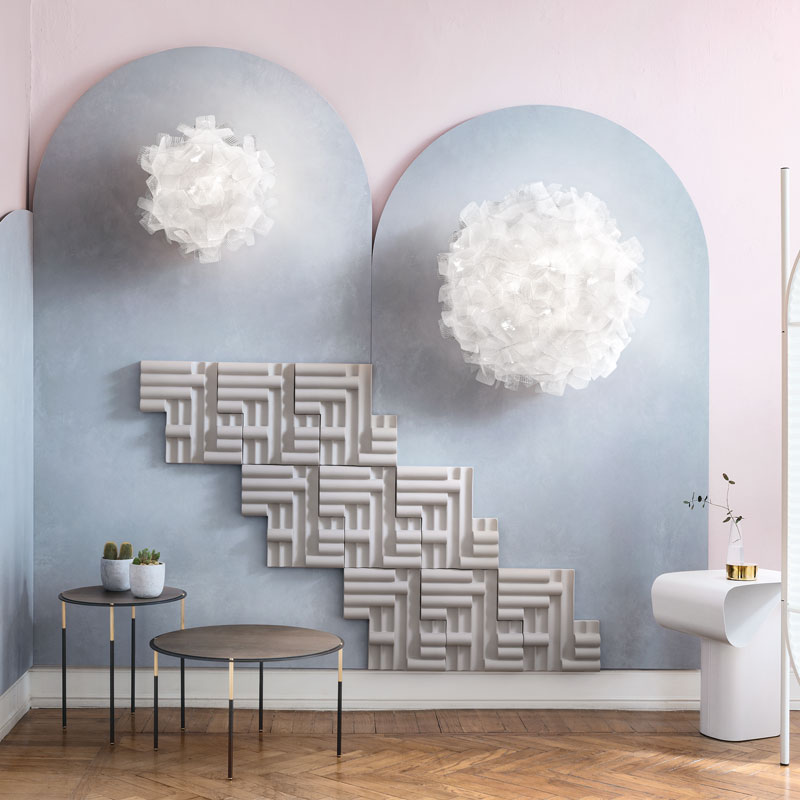 Представете си как изящен ръчно изработен букет от пикселни листенца се разстила по тавана ви като съвременен дигитален облак, превръщайки всяко помещение в галерия на модерното изкуство. Плафон Clizia L от дизайнера Adriano Rachele е въплъщение на женствеността - със своите форми и с текстуриран пикселен ефект, които се съчетават в перфектен баланс от отражения и прозрачност. Прилича на облак, който улавя първите променящи се лъчи на утринното слънце, обгръщайки помещението с модерна светлина за уютни вечери.