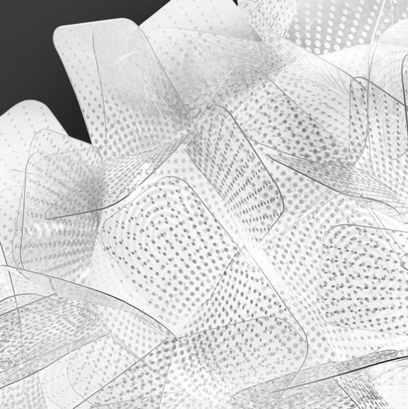 Cristalflex® материалът представлява връх на италианските иновации - технополимер, който предлага блясъка и прозрачността на кристала, но с добавените предимства да бъде лек, гъвкав и устойчив. Специалният пикселен ефект създава уникални игри на светлина и сенки. Осветителното тяло е с тегло от 4,5 кг и магнитна система за окачване, което позволява лесна инсталация, поддръжка и почистване.