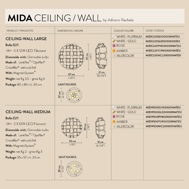 MIDA L е дизайнерски плафон, създаден от Адриано Рашеле. Вдъхновен от изисканите бижута на Ponte Vecchio във Флоренция, този впечатляващ модел превръща тавана или стената в истинска сцена на лукс и елегантност. Формата наподобява пъстроцветна мозайка от скъпоценни камъни, подредени в прецизна хармония.