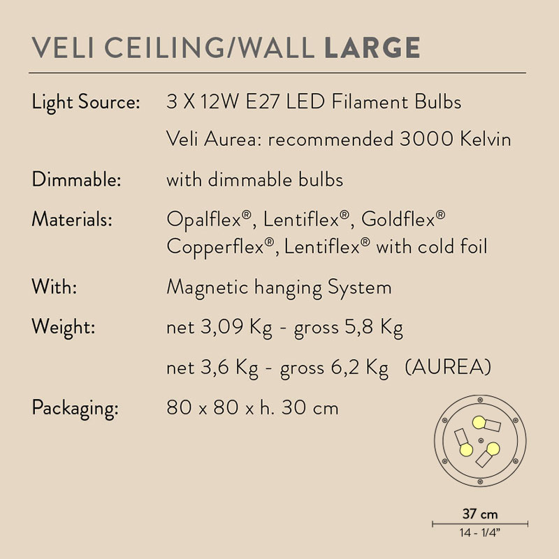 VELI FOLIAGE L е с магнитна система, която осигурява бърз и лесен монтаж, както и удобство при почистване. Осветителното тяло работи с 3 х 12W E27 LED крушки и е съвместимо с димиране чрез стандартен димерен ключ. С нетно тегло 3,09кг, плафонът е лек, практичен и надежден избор за дългосрочна употреба.