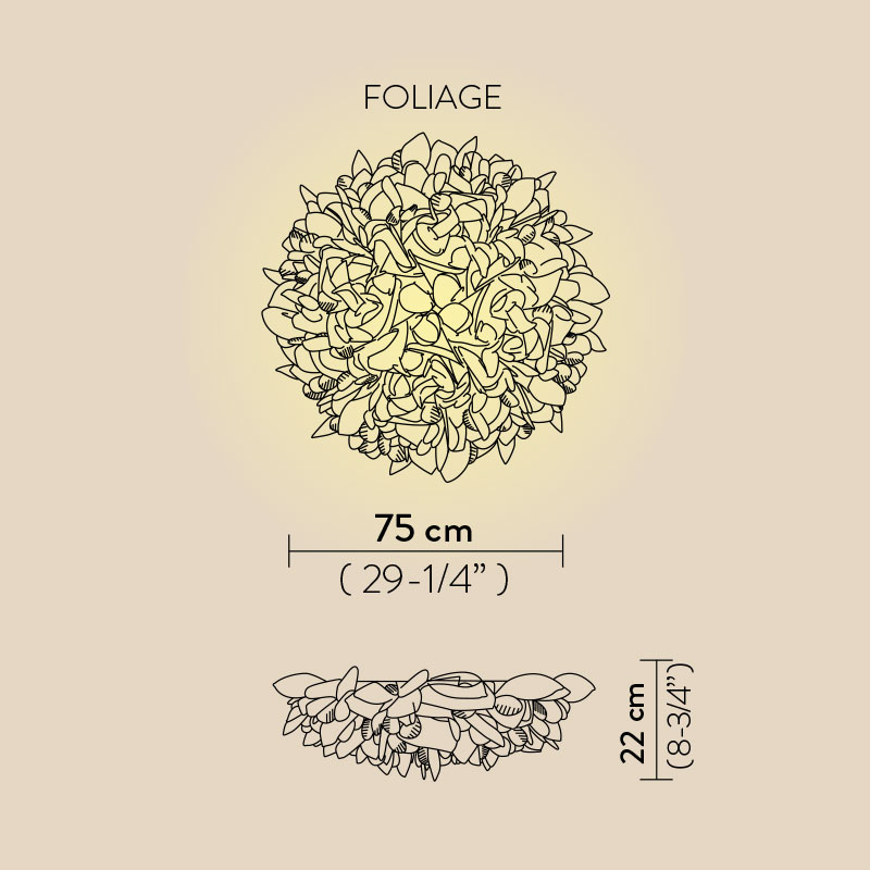 VELI FOLIAGE L е дизайнерски плафон, създаден от дизайнера Адриано Рашеле, който черпи вдъхновение от съвършенството на природата. Неговата форма е изградена от ръчно оформени модули, наподобяващи листа, които създават усещане за свежест, хармония и елегантност в интериора. Всеки детайл е внимателно изработен, за да внесе естествено излъчване и артистична динамика.