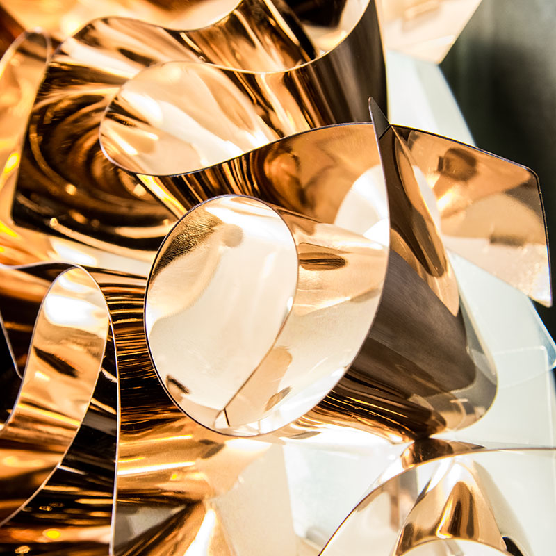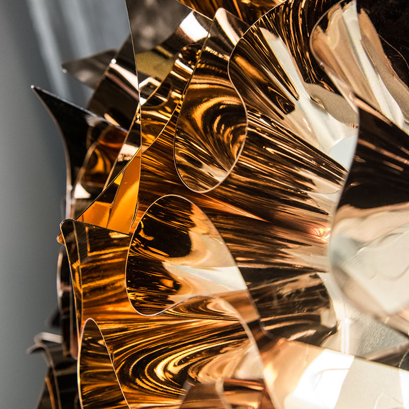 VELI COPPER M е дизайнерски плафон, създаден от Адриано Рашеле, който впечатлява със своята елегантна форма и топъл меден блясък. Вдъхновен от света на висшата мода, моделът съчетава изящество и артистичен стил, превръщайки всяко помещение в изискан интериор. Ръчно изработените модули са свързани в плавна и хармонична композиция, която излъчва престиж и изтънченост.