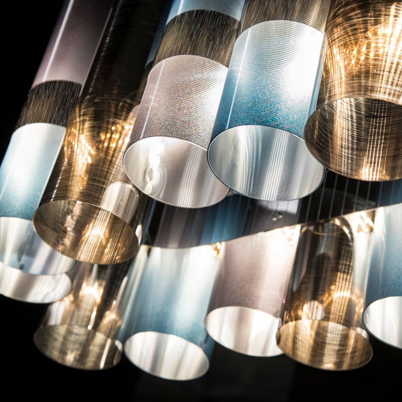 Всеки полилей от серията LA LOLLO 100 е изработен от комбинация на Lentiflex® и Lentiflex® with cold foil в градиентен цвят. Lentiflex® е патентован материал, разработен от италианската компания Slamp - технополимерен лист с лещовидна структура, наподобяваща поредица от призми, които улавят и насочват светлината, създавайки уникален визуален ефект припомнящ океански вълни. Градиентният преход от дълбоки сини към мистериозни лилави тонове добавя съвременна артистичност към ретро силуета. Този уникален подход прави всяко изделие единствено по рода си, с форми и текстури, които никога не могат да бъдат възпроизведени механично.