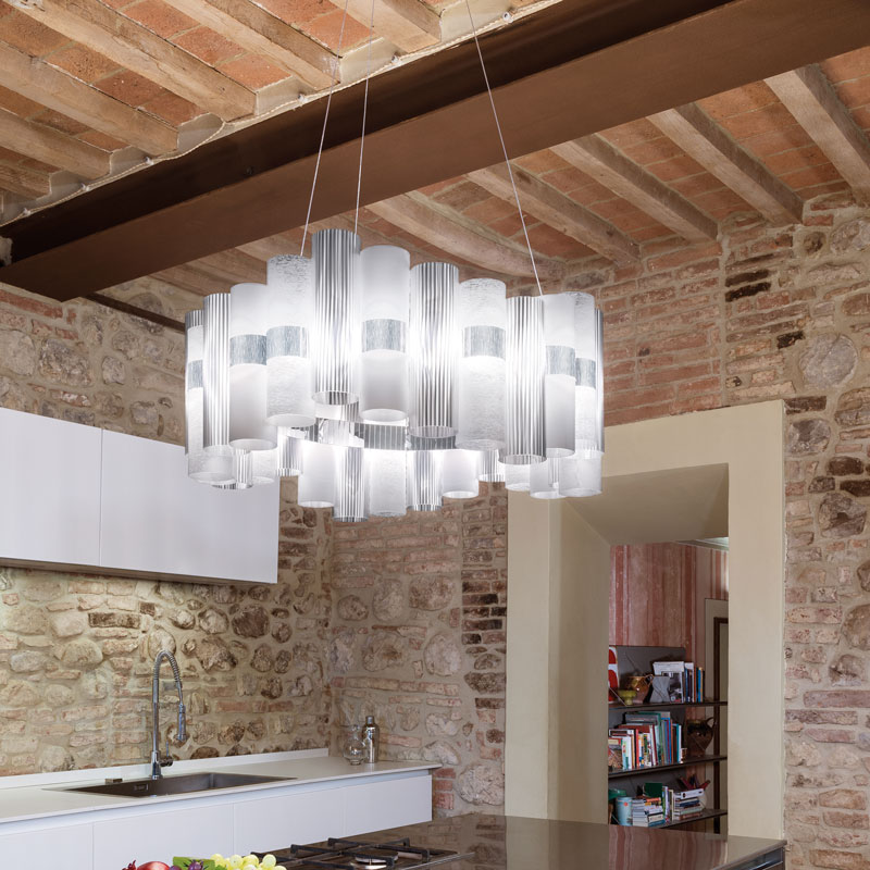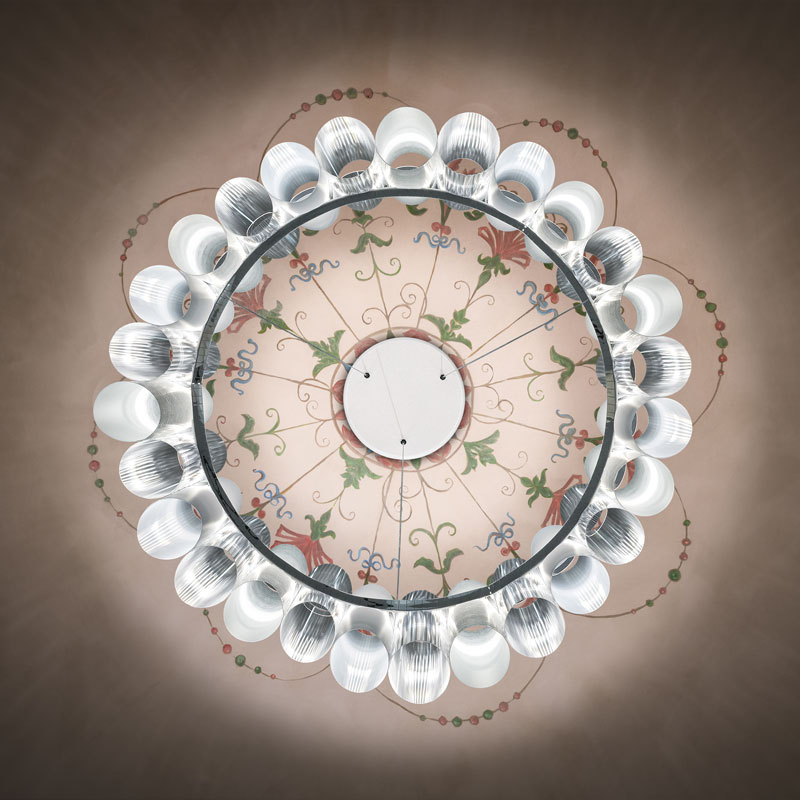 LA LOLLO е серия изработена от леки технополимерни цилиндри, разположени върху централен ринг с интегрирани LED диоди. LED системата е с мощност 80W, осигурява впечатляващите 9000 лумена, излъчва жълта уютна светлина 2700K и превъзходен индекс на цветопредаване CRI >90.Минималистичният му дизайн може да бъде персонализиран по заявка на клиента за по-мащабни инсталации.