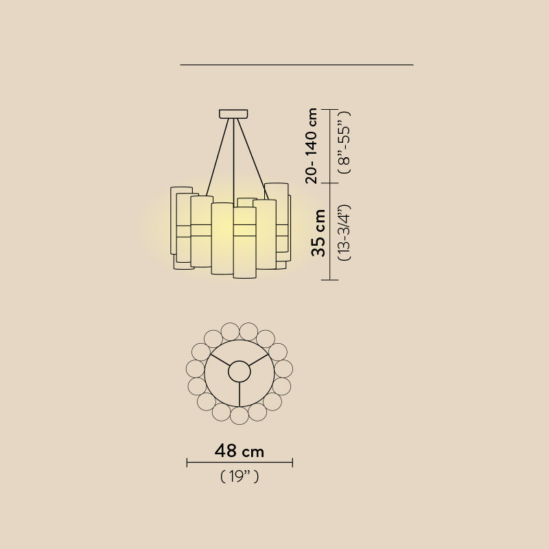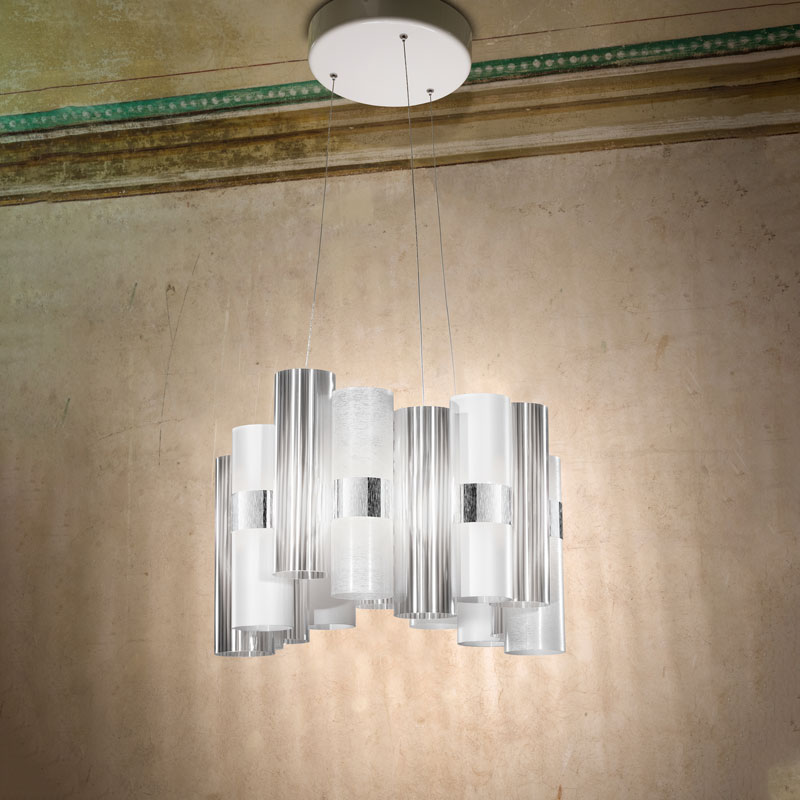 LA LOLLO M е серия от леки технополимерни цилиндри, разположени върху централен ринг с интегрирани LED диоди. LED системата с мощност 40W осигурява 4600 лумена, излъчва жълта уютна светлина 2700K и превъзходен индекс на цветопредаване CRI >90. Пищният дизайн може да бъде персонализиран по заявка на клиента за мащабни инсталации.
