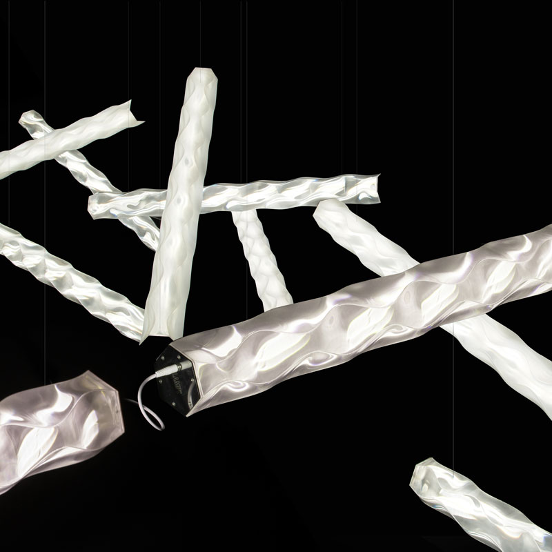 Всеки полилей от серията HUGO е изработен от Lentiflex® - патентован материал, разработен от италианската компания Slamp. Lentiflex® е технополимерен лист с лещовидна структура, наподобяваща поредица от призми, които улавят и насочват светлината. Флуидният ефект на разсейвателя е резултат от изследвания върху наклона на материала Lentiflex® от творческия отдел на Slamp, постигайки зашеметяващ ефект на отражение на водата. Този уникален подход прави всяко изделие единствено по рода си, с форми и текстури, които никога не могат да бъдат възпроизведени механично.