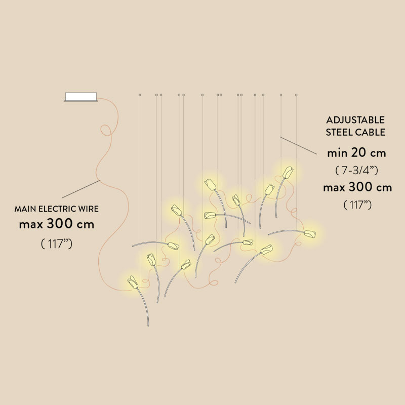 Четиринадесетте LED източника с мощност 3,2W всеки, генерират 6300 лумена топла бяла светлина 3000K, създавайки осветление с пълна гъвкавост за адаптиране към всякакви помещения. Всяко лале може да бъде позиционирано индивидуално според вашите предпочитания, създавайки уникална композиция, която никой друг няма, докато почти невидимите кабели държат окачените цветя като свободно витаещи растения.