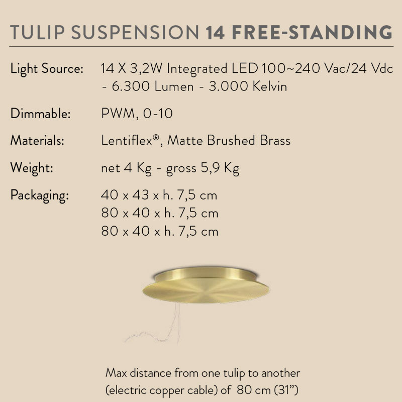 Със своето тегло от 4 кг, TULIP 14 FREE STANDING предлага свободни групи от четиринадесет цвята, които могат да бъдат инсталирани според личните предпочитания и наличното помещение. LED крушките са включени и могат да се сменят, което гарантира дългогодишна употреба с пълна творческа свобода.