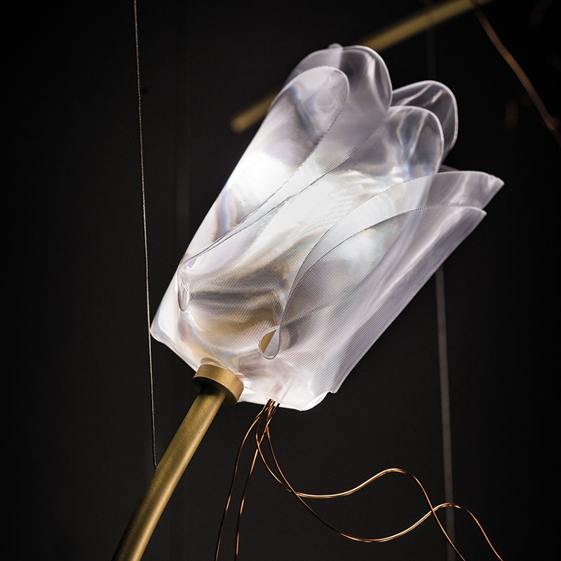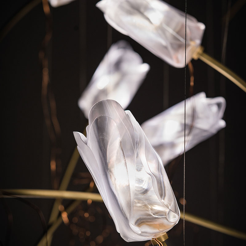 Всяко лале е изработено от Lentiflex® чрез ръчното моделиране на Slamp, което прави всяко цвете уникално произведение на изкуството. PRISMA покритието създава кристален ефект, който пречупва светлината в хиляди малки отражения, докато матовата четкана месинг основа добавя топлина и благородство. Медните проводници се преплитат между цветята като естествени лозички.