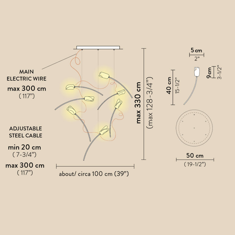 Седемте LED източника с мощност 3,2W всеки генерират общо 3150 лумена топла бяла светлина 3000K, създавайки атмосфера като в истинска градина. Всяко лале е позиционирано под специфичен ъгъл, за да създаде усещането за естествена растителна форма, докато почти невидимите кабели държат окачените цветя като нежни стебла.