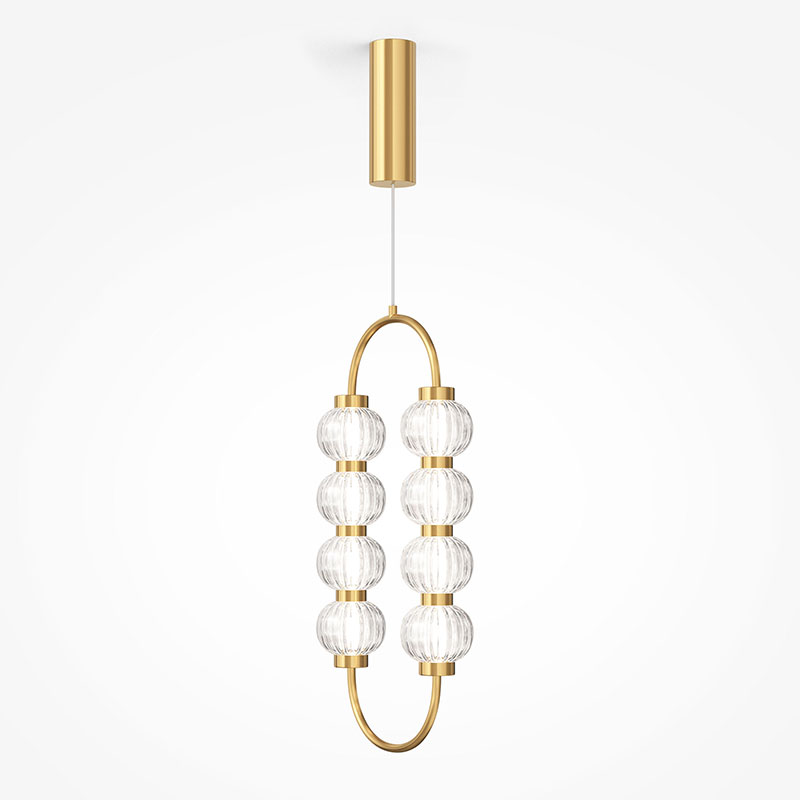 Дизайнерски полилей Amulet е изработен от метал в златист цвят и разсейватели от прозрачно стъкло с фина релефна текстура. Осветителното тяло е с овална форма и хармонична подредба на светлоизточниците, което го превръща в елегантен акцент.