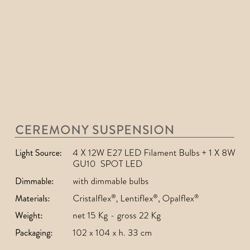 Дизайнерски полилей Ceremony L, изработен от революционния материал Opalflex® в чист бял цвят и метална конструкция. Висящата лампа е с четири LED крушки с филамент E27 12W и една допълнителна LED крушка GU10 8W, които излъчват приятна и топла светлина. Осветителното тяло е с възможност за димиране - намаляване и увеличаване на силата на светене от слаба към силна и обратно, посредством използване на димируеми крушки.