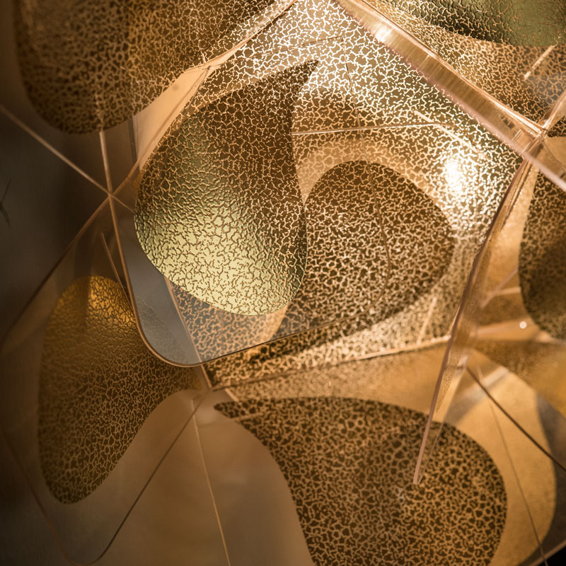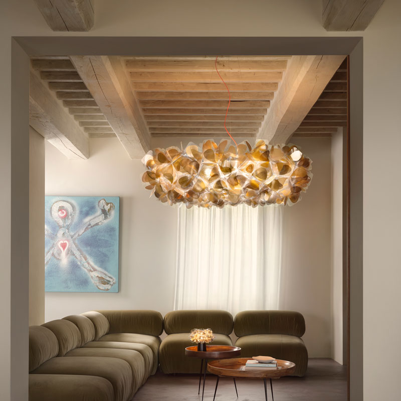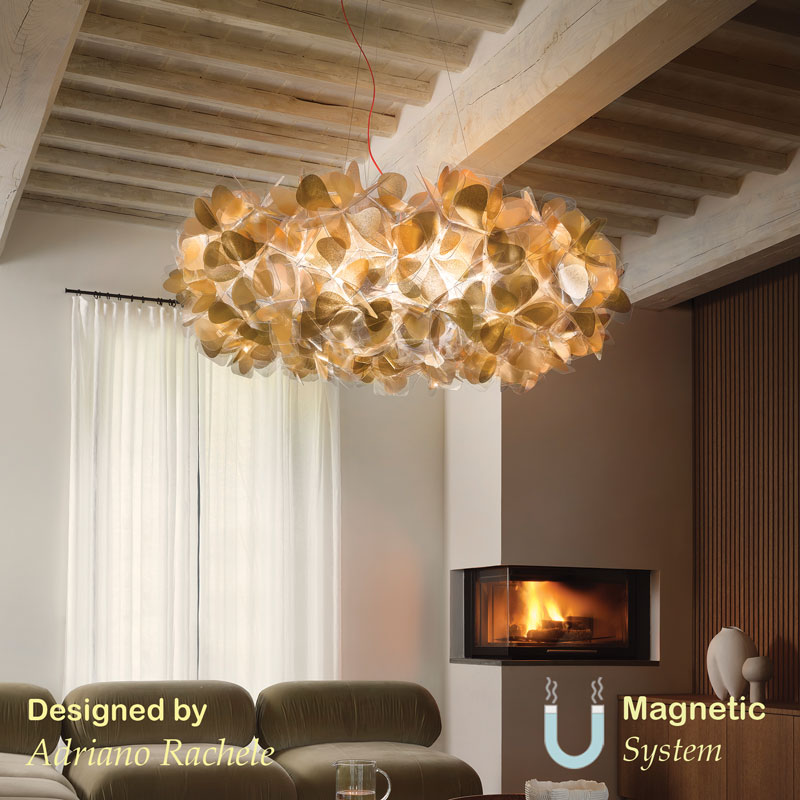 Материалът Cristalflex® със специалното златисто фолио демонстрира върха на технополимерното изкуство - авангарден материал с кристално великолепие и диамантена прозрачност, усъвършенстван с луксозното двустранно златно покритие, което се прилага студено и осигурява метален блясък. Декоративният материал позволява на светлината да преминава меко и равномерно през орнаментите, подчертавайки силуетите им. Величествената конструкция тежи 16,6 кг и осигурява впечатляващо осветление, способно да трансформира най-луксозните интериори. При необходимост можете да добавите 6-метров кабел (CLISXXLGNM06R00000EU) за по-голяма свобода при позициониране.