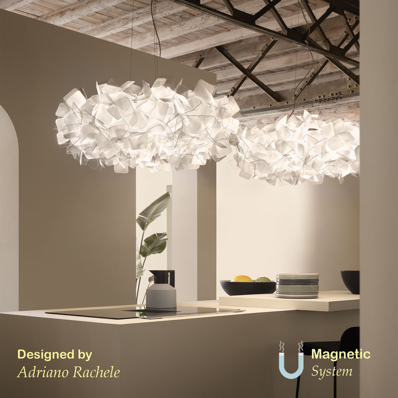 Осветителното тяло е изработено от Lentiflex® със своята лещовидна структура, наподобяваща призматична поредица, улавя и насочва осветлението, генерирайки флуиден визуален ефект. Cristalflex® допълва с кристалния си блясък и диамантена прозрачност, обогатени с лекота, еластичност и здравина. Конструкцията тежи 2,94 кг и използва магнитна система за практична инсталация, почистване и поддръжка. При необходимост можете да добавите 6-метров кабел (CLISL00FUM06T00000EU) за по-голяма свобода при позициониране.