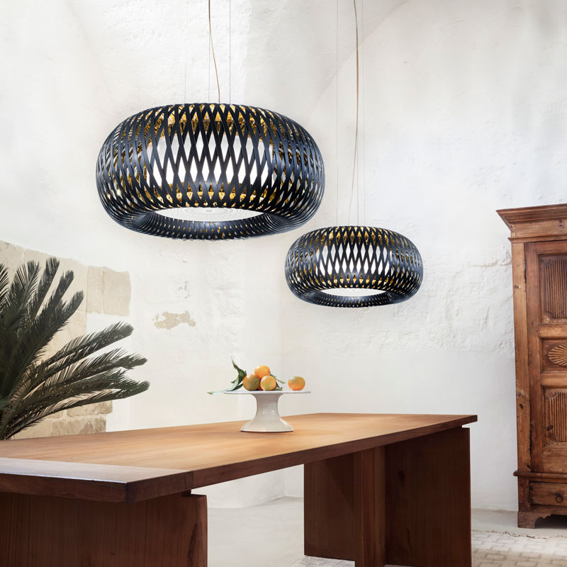 Полилеят е изработен от метализиран поликарбонат в изискана комбинация от черно с вътрешен златист завършек. Впечатляващата му плетена структура създава уникална игра на светлини и сенки, която придава дълбочина и характер на всяко помещение.
