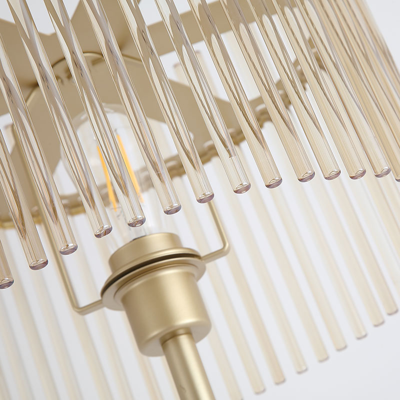 Абажурът е изграден от вертикално разположени стъклени елементи в цвят шампанско, които красиво пречупват светлината и създават топла, мека и уютна атмосфера. Светлинният ефект е деликатен и ненатрапчив, като придава усещане за комфорт и изтънченост.