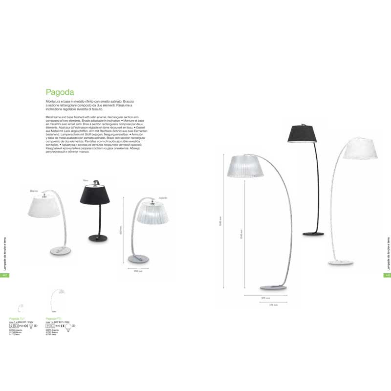 Лампион с елегантна линия Pagoda, с метално тяло с покритие от сатениран никел и правоъгълно рамо, съставено от две части. Абажур позволяващ регулиране на наклона и покрит с текстил. Предлага се в бял, черен или сребърен цвят. Производител Идеал Лукс, Италия.